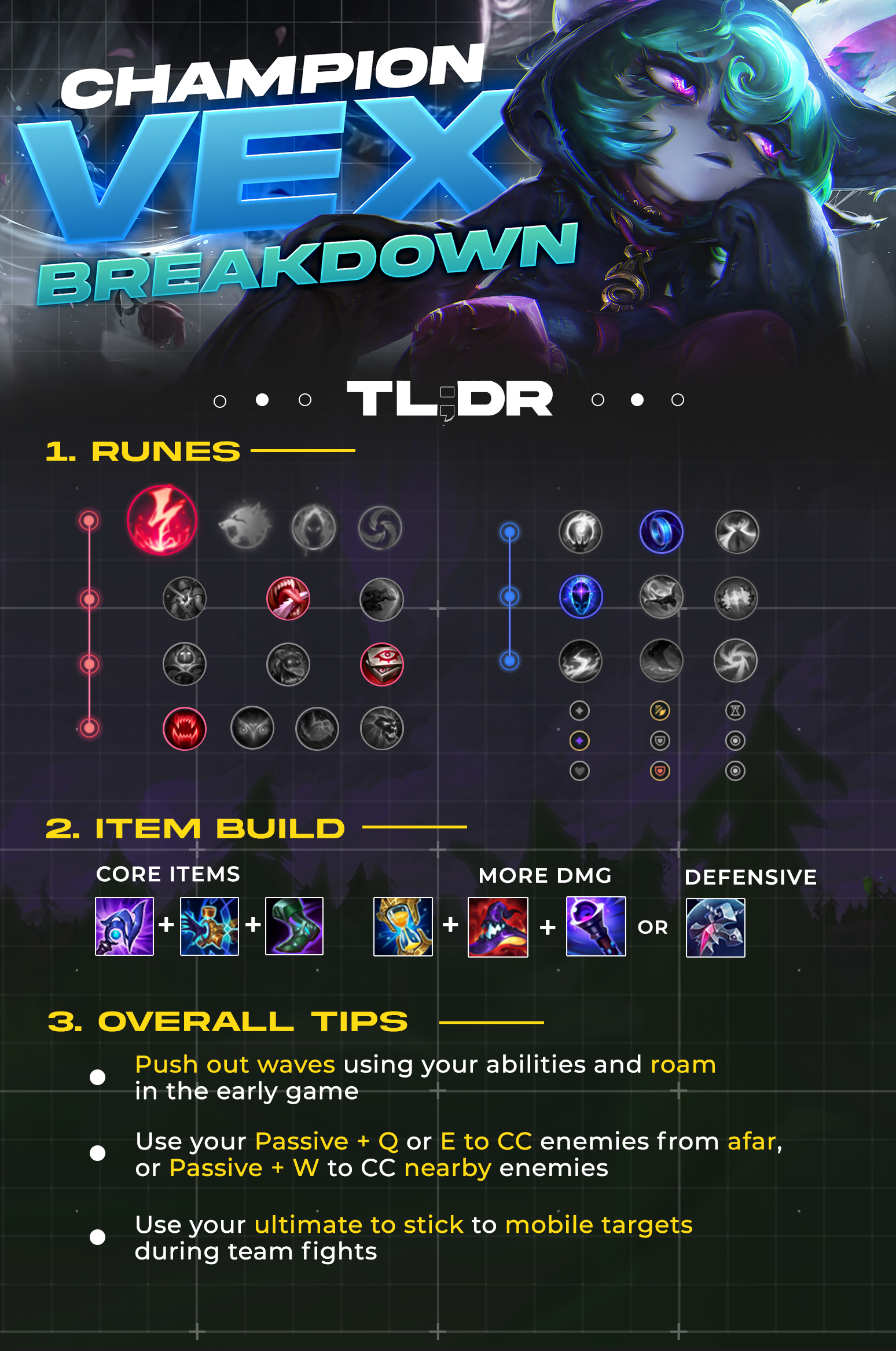 Shadow Surge (ultimate) is an incredible tool during team fights thanks to its eclectic uses. If the enemy team is clumped together and your passive is available, Vex can dive into them and use her W (Personal Space) for an instant AoE CC. If an enemy has a lot of mobility, Vex can follow them if you are able to time your ultimate correctly and recast it after they have used their mobility tools.