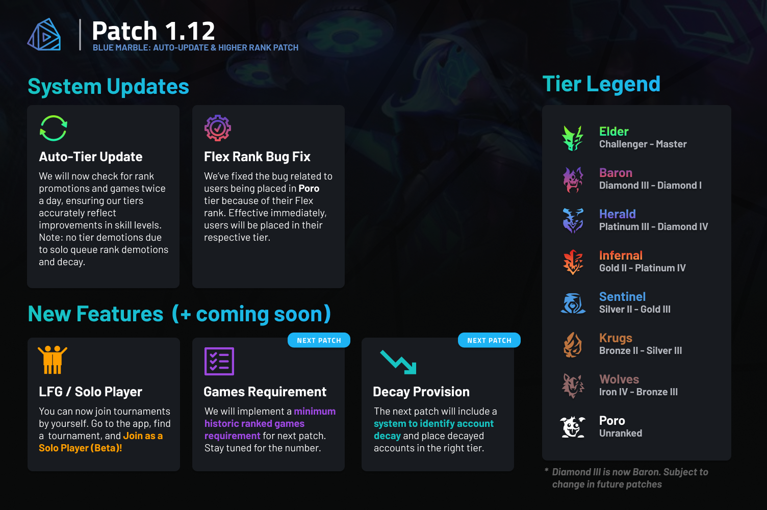 We will now check for rank promotions and games twice a day, ensuring our tiers accurately reflect improvements in skill levels. Note: no tier demotions due to solo queue rank demotions and decay.