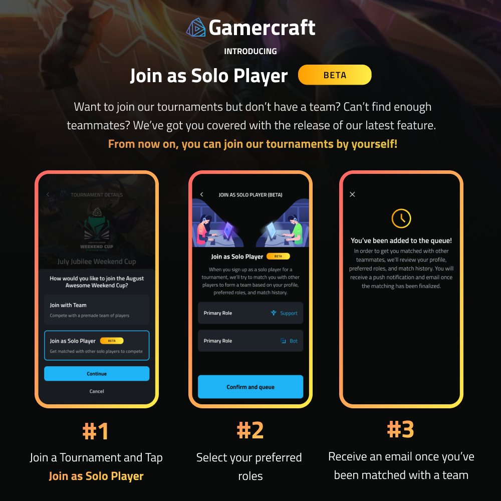Want to join our tournaments but don’t have a team? Can’t find enough teammates? We’ve got you covered with the release of our latest feature.