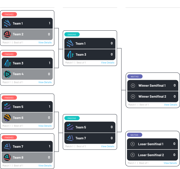 For the duration of our Beta stage, most of our tournaments will be short-form (single elimination, 8-team tournaments) with no big time commitments and motivating prize pools. Though there might be some bigger or longer tournaments the typical bracket looks like this:
